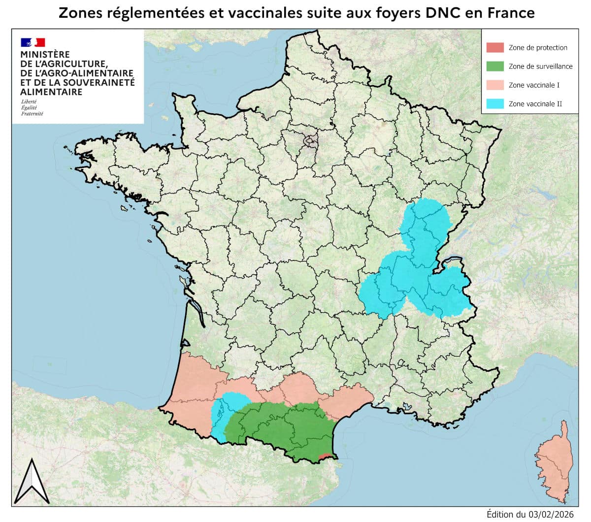 L’arrêté ministériel relatif à la gestion de la DNC évolue afin d’interdire tout mouvement de bovins non valablement vaccinés au sein d’une même zone vaccinale. En parallèle l’Espagne a accepté, le 05/02, l’importation depuis la France de bovins issus de zone Vaccinale I et II. De plus, un maintien de la vaccination pour 2026 dans les zones concernées par la maladie en 2025 a été votée ce lundi 09/02.