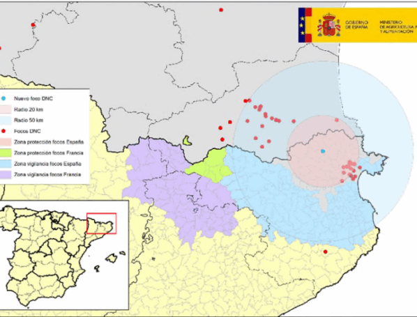 Ce nouveau foyer n’entraîne pas d’extension de la zone de restriction établie depuis les premiers signalements à Gérone. Il est localisé dans un élevage extensif de pâturages individuels abritant un troupeau de 106 bovins dans la région de l’Alt Empordà, dans la province de Gérone. La vaccination de l’élevage a eu lieu en octobre dernier, mais, en raison de la difficulté de manipulation de ce type d’animaux, il n’a pas été possible de vacciner l’ensemble du cheptel. Quatre animaux non vaccinés ont été testés positifs à la souche de terrain du virus DNC.