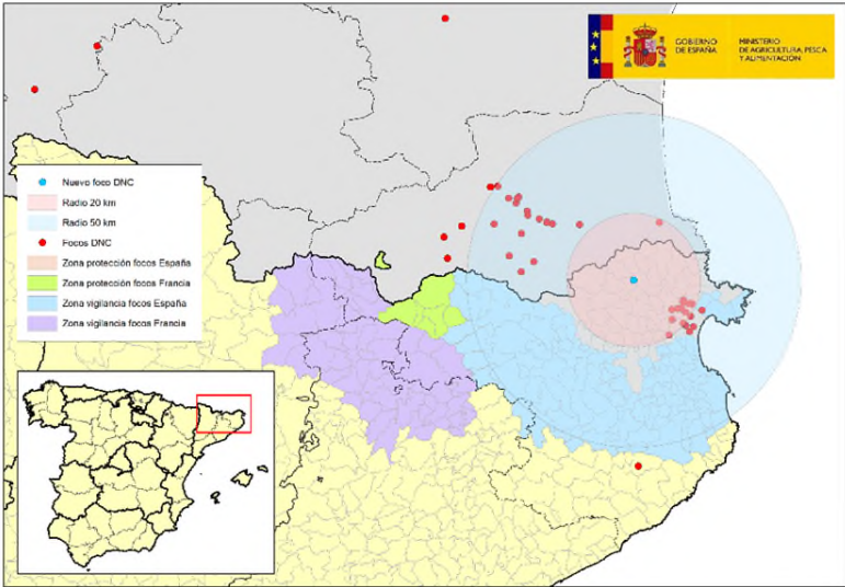 Ce nouveau foyer n’entraîne pas d’extension de la zone de restriction établie depuis les premiers signalements à Gérone. Il est localisé dans un élevage extensif de pâturages individuels abritant un troupeau de 106 bovins dans la région de l’Alt Empordà, dans la province de Gérone. La vaccination de l’élevage a eu lieu en octobre dernier, mais, en raison de la difficulté de manipulation de ce type d’animaux, il n’a pas été possible de vacciner l’ensemble du cheptel. Quatre animaux non vaccinés ont été testés positifs à la souche de terrain du virus DNC.