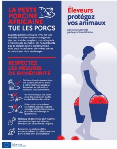La campagne large de communication basée sur des messages de prévention se poursuit. Les supports de communication sont disponibles sur le site du ministère : https://agriculture.gouv.fr/peste-porcine-africaine-le-kit-de-communication