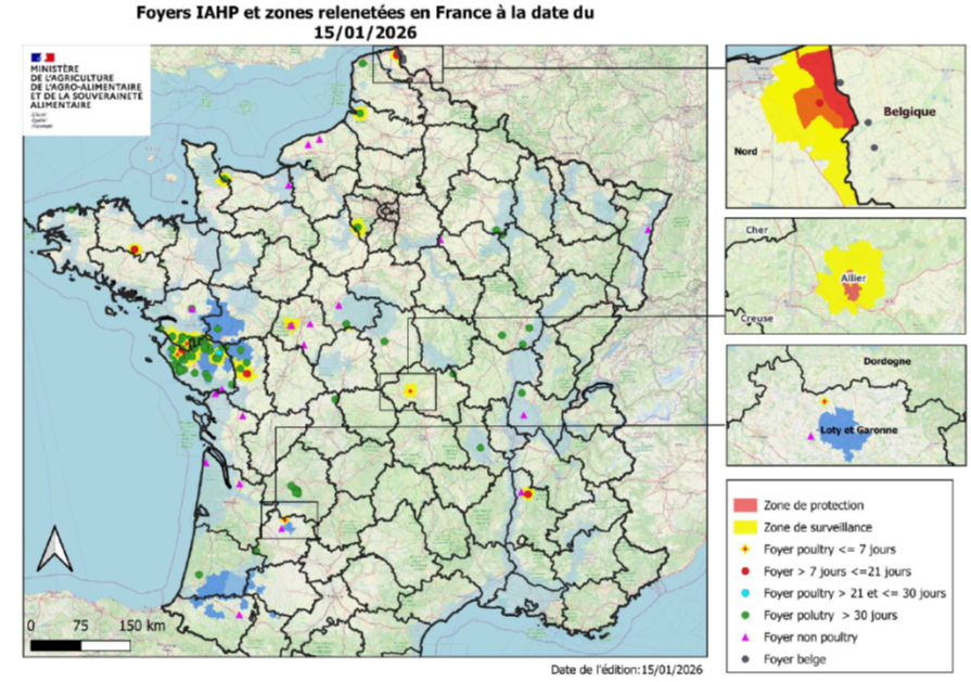 En date du 16/01/2026, nous comptons 132 foyers IAHP pour cette saison 2025/2026, dont 112 foyers en élevage commercial, soit 4 foyers de plus depuis la semaine dernière. L’incidence ralentit mais reste présence en faune comme en élevage.